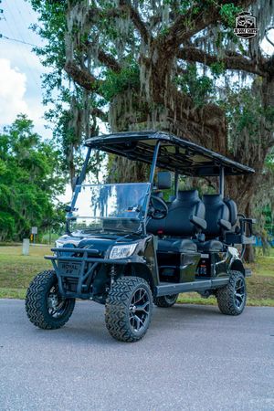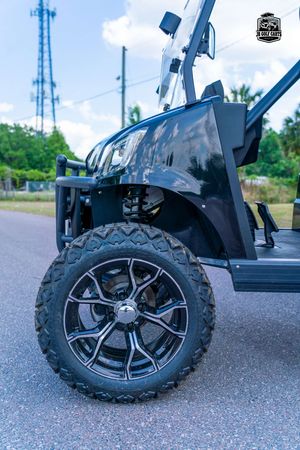 ✔️ Specifications:Steel frame or upgrade to aluminum (pending availability), four wheel disc/electromagnetic brakes, 400amp controller, 5kW AC motor, on-board quick lithium charger, 5” lift with 14x10x23” rims and off-road tires.