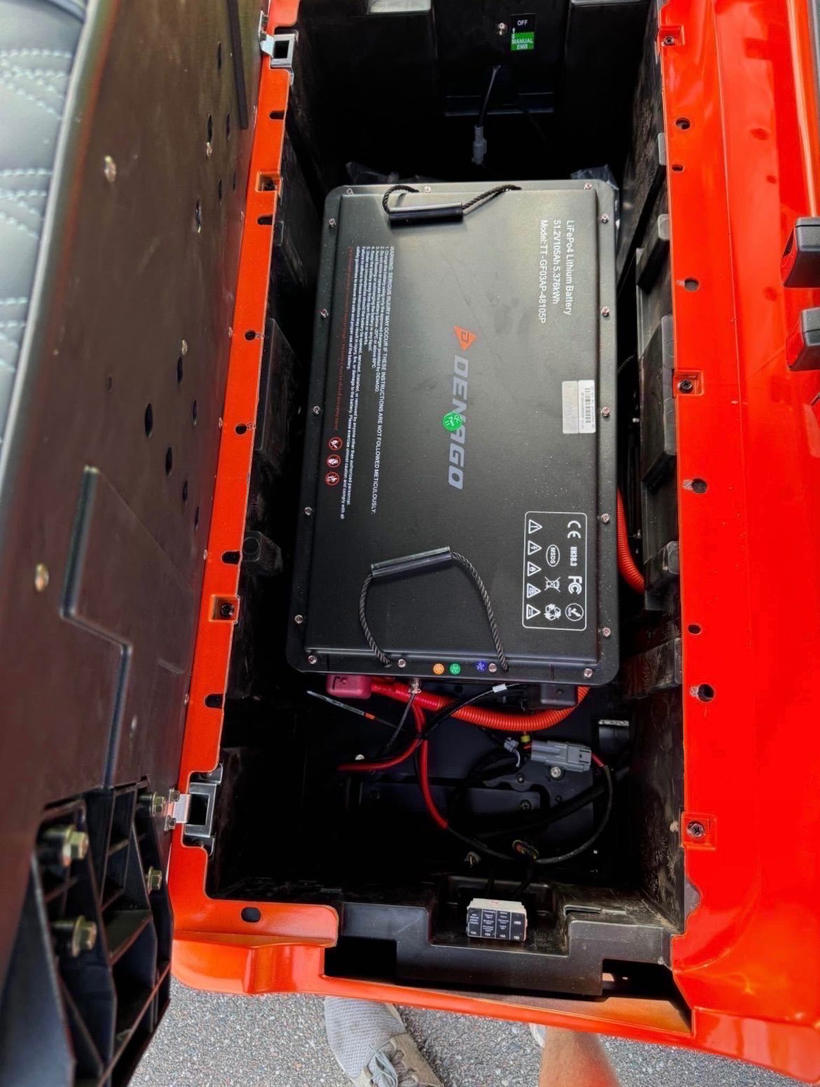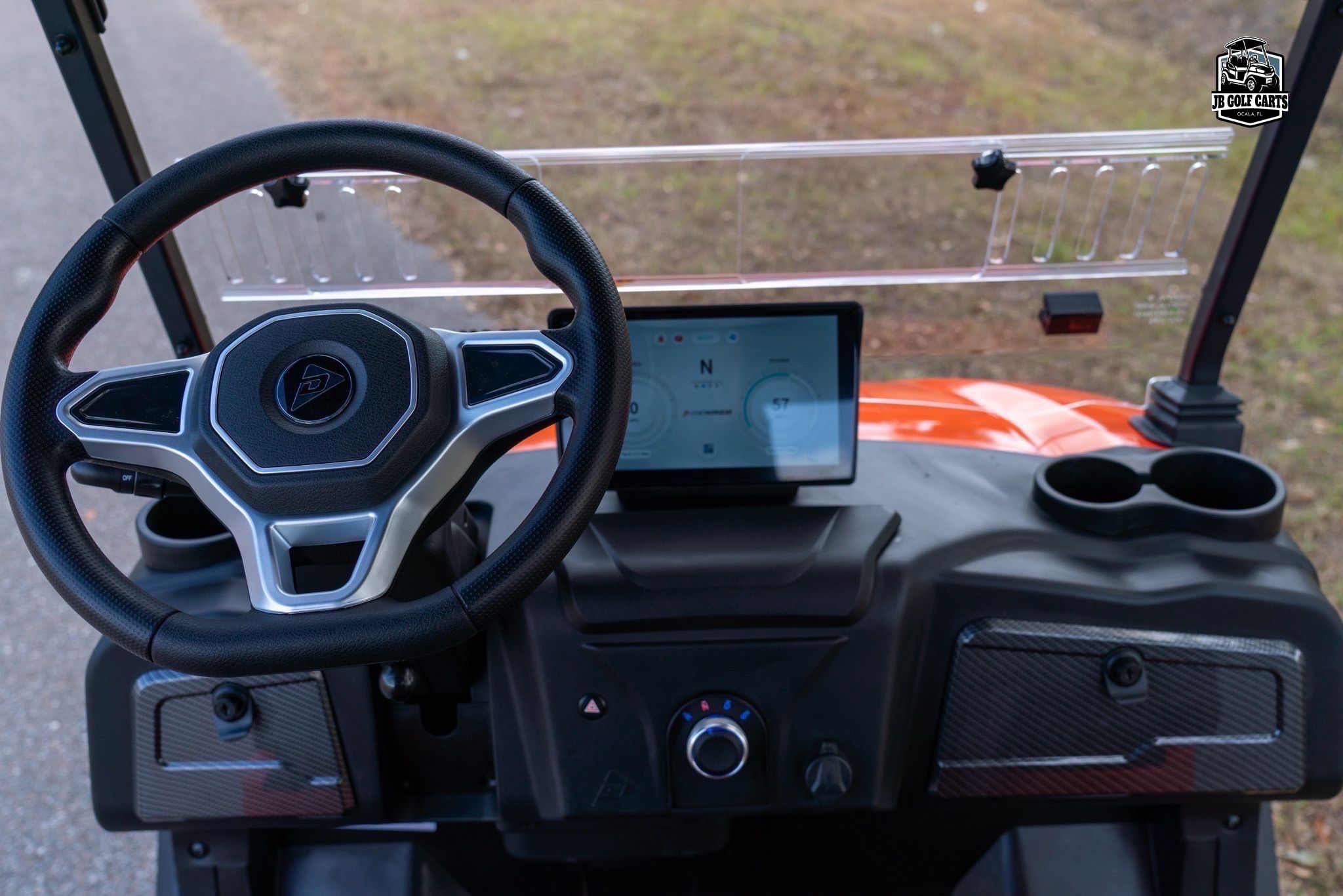 Digital dash with Apple CarPlay and Android Auto, FM Radio, charge indicator, digital speedometer and odometer, bluetooth speakers, side and rearview mirrors with integrated turn signals, tilt steering wheel, self-canceling turn signals, custom Denago seats, USB and USB-C charging ports, 110V outlet capability, back-up camera, locking front dash, floor mats, off-road tires. Speed 25mph.