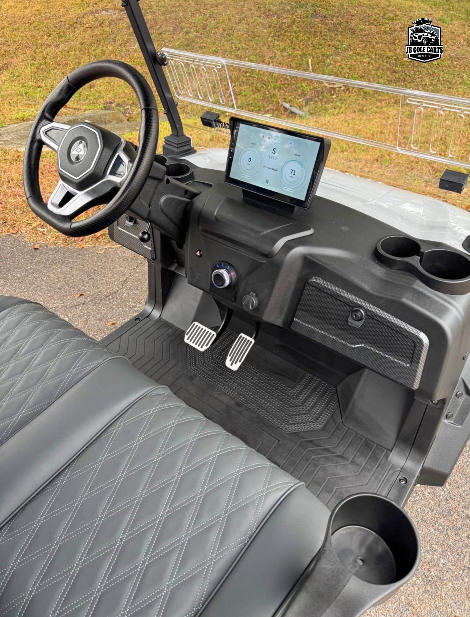Digital dash with Apple CarPlay and Android Auto, FM Radio, charge indicator, digital speedometer and odometer, bluetooth speakers, side and rearview mirrors with integrated turn signals, tilt steering wheel, self-canceling turn signals, custom Denago seats, USB and USB-C charging ports, 110V outlet capability, back-up camera, locking front dash, floor mats, off-road tires. Speed 25mph.