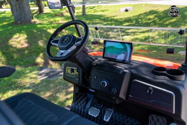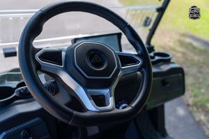 Digital dash with Apple CarPlay and Android Auto, FM Radio, charge indicator, digital speedometer and odometer, LED bluetooth sound bar, side and rearview mirrors with integrated turn signals, tilt steering wheel, self-canceling turn signals, custom Denago seats, USB and USB-C charging ports, 110V outlet, back-up camera, locking rear trunk and front dash, step rails, floor mats, off-road tires. Speed 25mph.