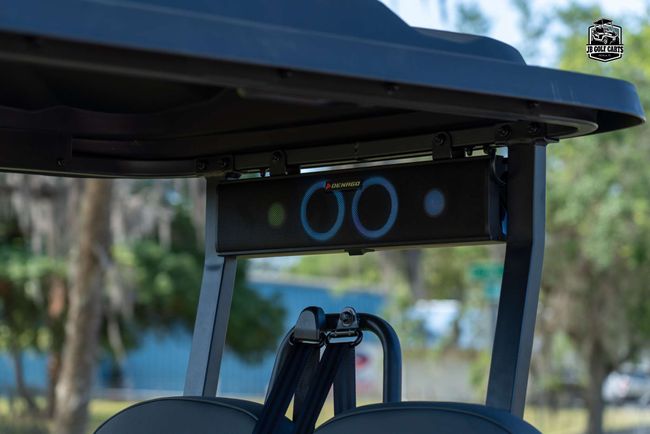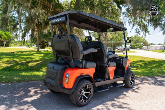 Digital dash with Apple CarPlay and Android Auto, FM Radio, charge indicator, digital speedometer and odometer, LED bluetooth sound bar, side and rearview mirrors with integrated turn signals, tilt steering wheel, self-canceling turn signals, custom Denago seats, USB and USB-C charging ports, 110V outlet, back-up camera, locking rear trunk and front dash, step rails, floor mats, off-road tires. Speed 25mph.