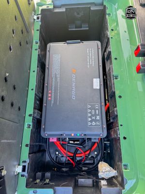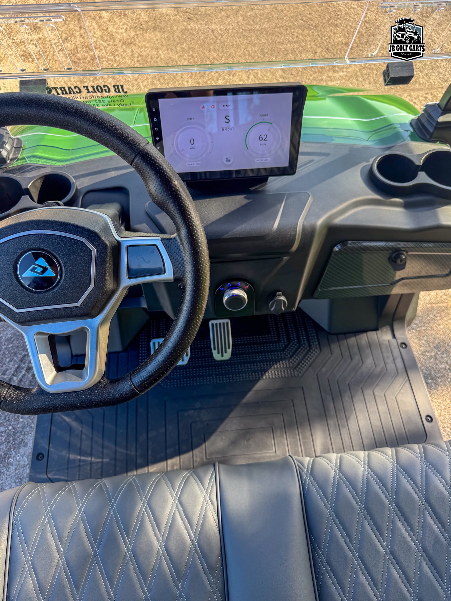 Digital dash with Apple CarPlay and Android Auto, FM Radio, charge indicator, digital speedometer and odometer, LED bluetooth sound bar, side and rearview mirrors with integrated turn signals, tilt steering wheel, self-canceling turn signals, custom Denago seats, USB and USB-C charging ports, 110V outlet, back-up camera, locking rear trunk and front dash, step rails, floor mats, off-road tires. Speed 25mph.