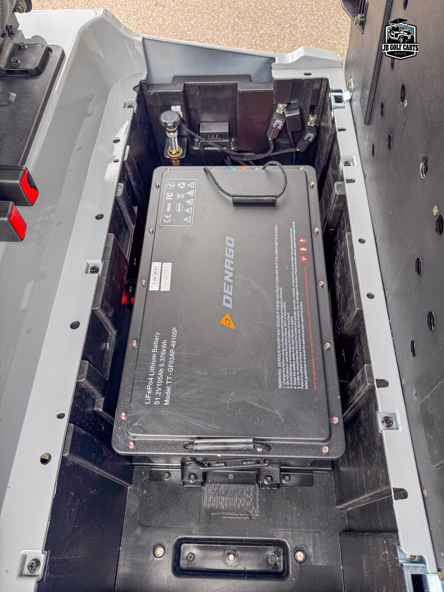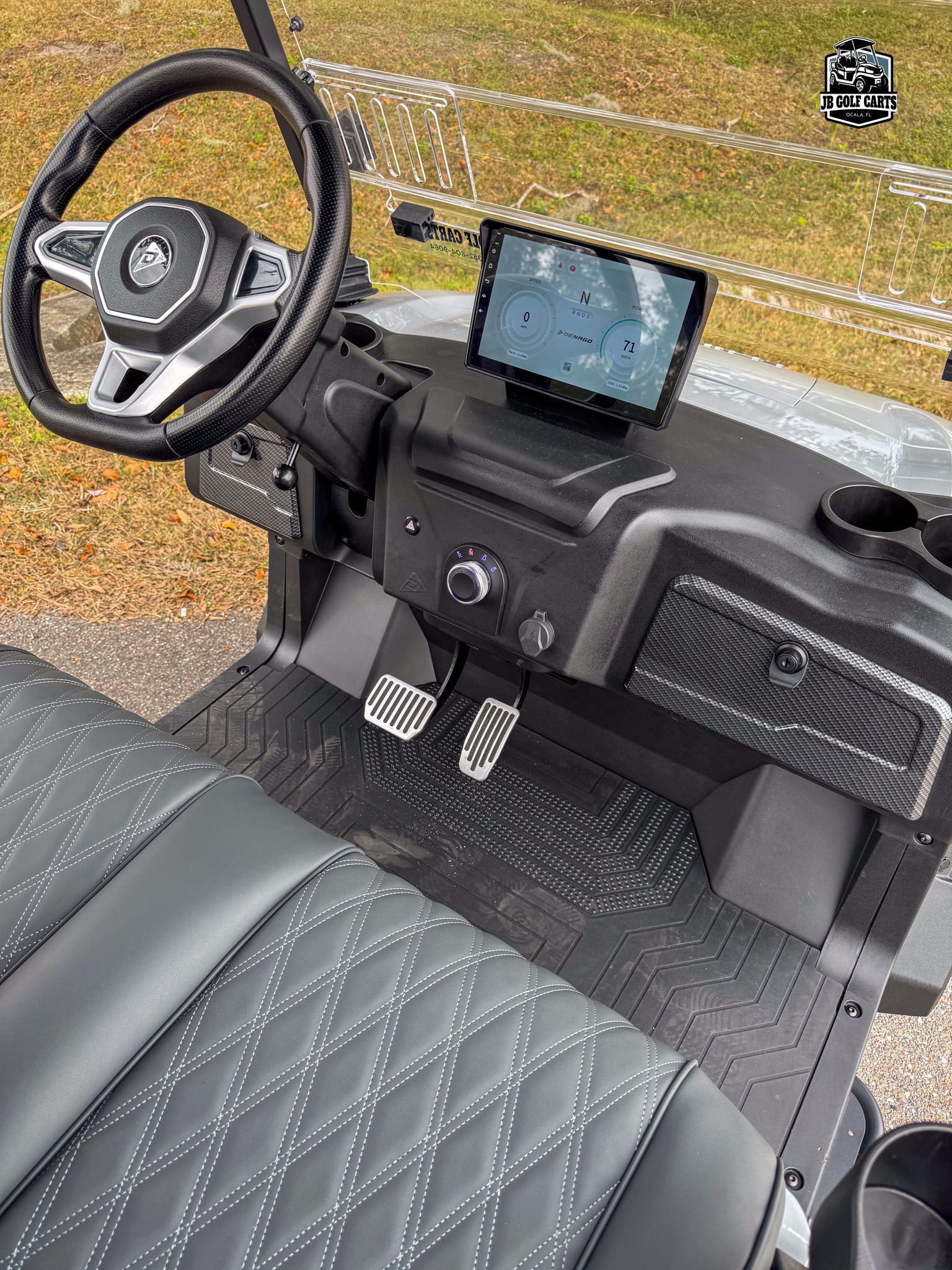 Digital dash with Apple CarPlay and Android Auto, FM Radio, charge indicator, digital speedometer and odometer, LED bluetooth sound bar, side and rearview mirrors with integrated turn signals, tilt steering wheel, self-canceling turn signals, custom Denago seats, USB and USB-C charging ports, 110V outlet, back-up camera, locking rear trunk and front dash, step rails, floor mats, off-road tires. Speed 25mph.