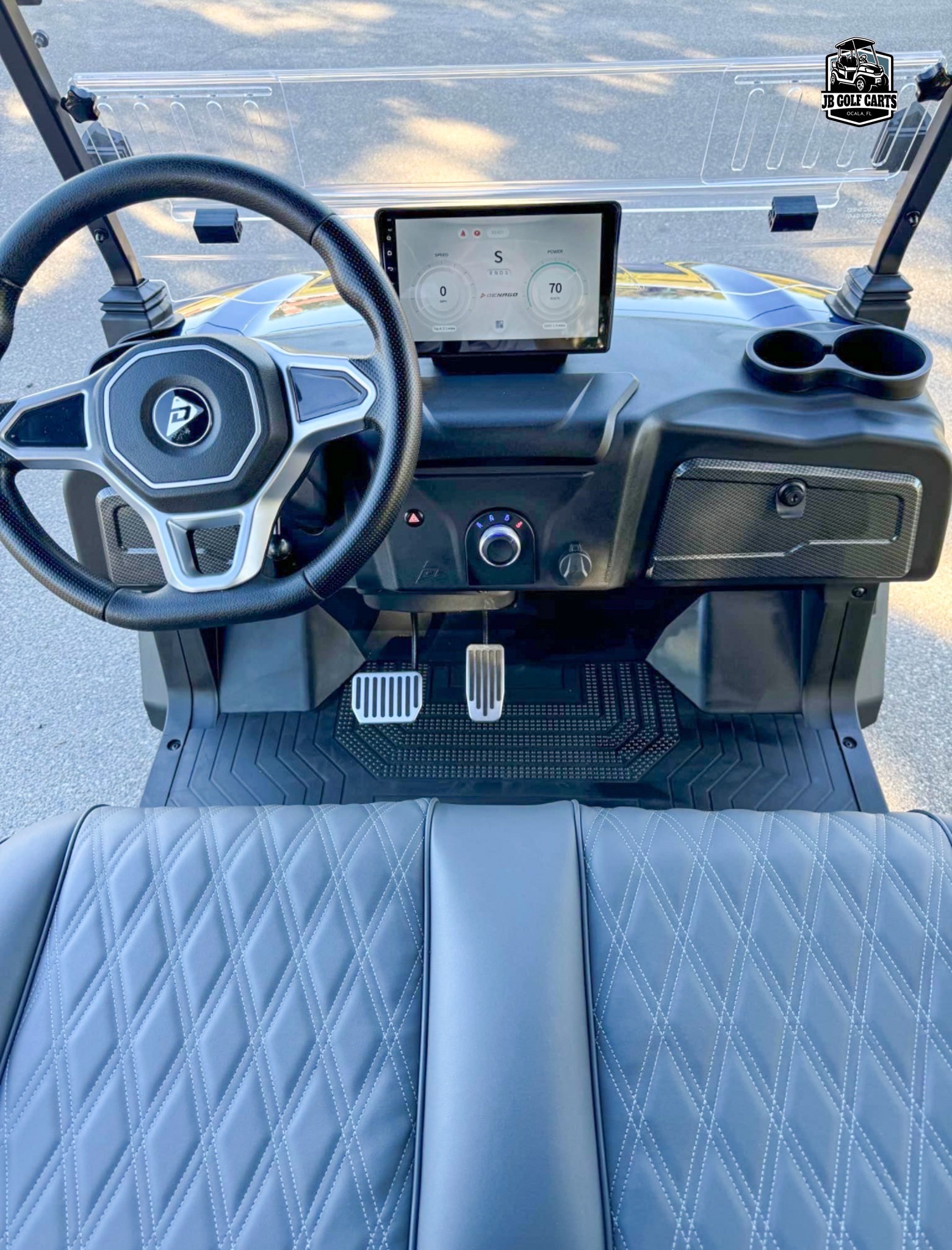 Digital dash with Apple CarPlay and Android Auto, FM Radio, charge indicator, digital speedometer and odometer, side and rearview mirrors with integrated turn signals, tilt steering wheel, self-canceling turn signals, custom Denago seats, USB and USB-C charging ports, 110V outlet, back-up camera, trunk and front dash, off-road tires. Speed 25mph.