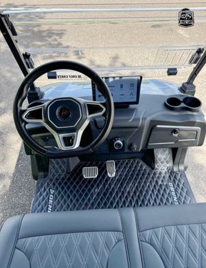 Digital dash with Apple CarPlay and Android Auto, FM Radio, charge indicator, digital speedometer and odometer, LED bluetooth sound bar, side and rearview mirrors with integrated turn signals, tilt steering wheel, self-canceling turn signals, custom Denago seats, USB and USB-C charging ports, 110V outlet, back-up camera, locking rear trunk and front dash, step rails, floor mats, off-road tires. Speed 25mph.
