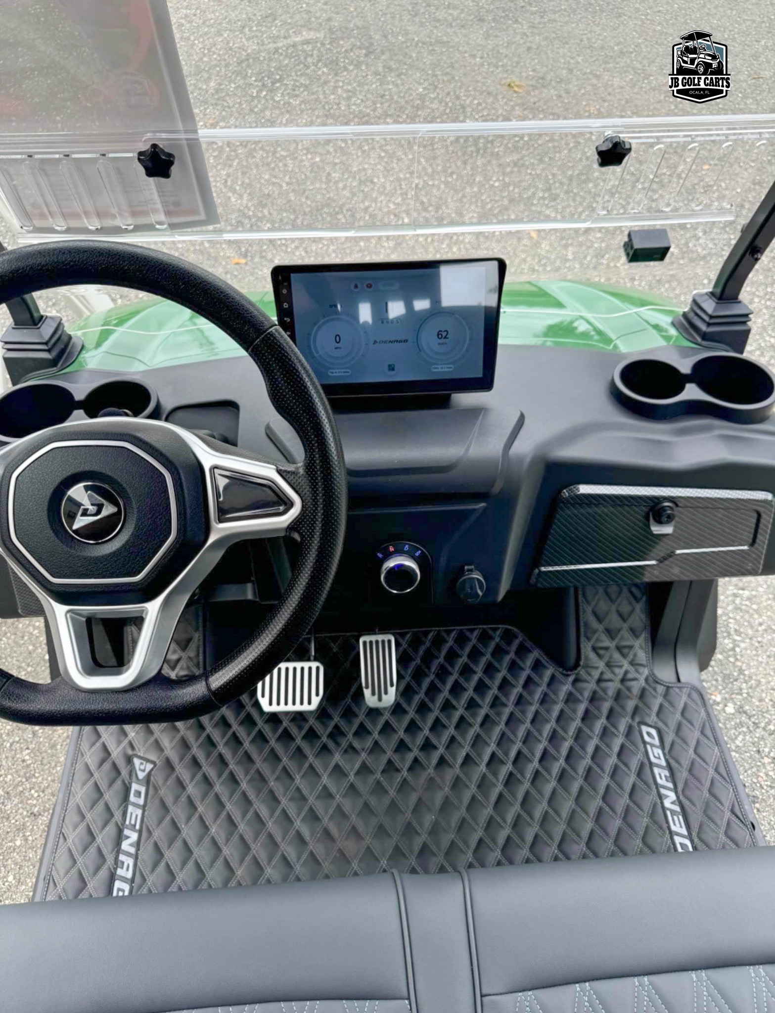 Digital dash with Apple CarPlay and Android Auto, FM Radio, charge indicator, digital speedometer and odometer, LED bluetooth sound bar, side and rearview mirrors with integrated turn signals, tilt steering wheel, self-canceling turn signals, custom Denago seats, USB and USB-C charging ports, 110V outlet, back-up camera, locking rear trunk and front dash, step rails, floor mats, off-road tires. Speed 25mph.